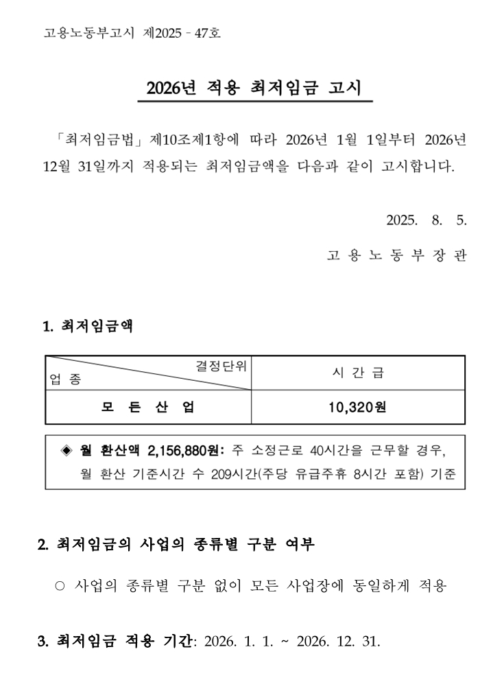 결정된 2026년 최저임금은 시급 10,320원.